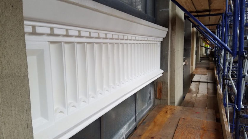 Details: Glass Fiber Reinforced Polymer (GFRP) is a strong lightweight material that was engineered to match existing castings on the building. GFRP was used to fabricate highly detailed pieces such as (120) Spandrel panels, (40) Scrolls, and (3) Rosettes for the exterior of the building.